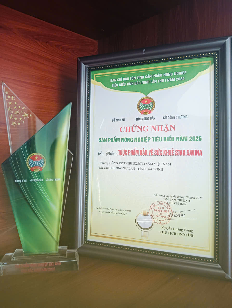 Ngày 13/10/2025 – Ngày Doanh nhân Việt Nam, là một dấu mốc đặc biệt đối với Công ty TNHH Sản xuất và Thương mại Sâm Việt Nam khi sản phẩm Thực phẩm bảo vệ sức khỏe Star Savina được nhận “Sản phẩm Nông nghiệp tiêu biểu tỉnh Bắc Ninh lần thứ I”. Đây không chỉ là sự ghi nhận cho nỗ lực không ngừng trong hành trình gìn giữ và phát triển Sâm Nam Núi Dành cùng các sản phẩm chủ lực của tỉnh nhà, mà còn là nguồn động lực để chúng tôi tiếp tục sáng tạo – mang những giá trị tốt đẹp từ thiên nhiên đến với sức khỏe cộng đồng. Xin chân thành cảm ơn Quý khách hàng, đối tác, ban lãnh đạo công ty cùng toàn thể nhân viên đã luôn tin tưởng, đồng hành và ủng hộ!